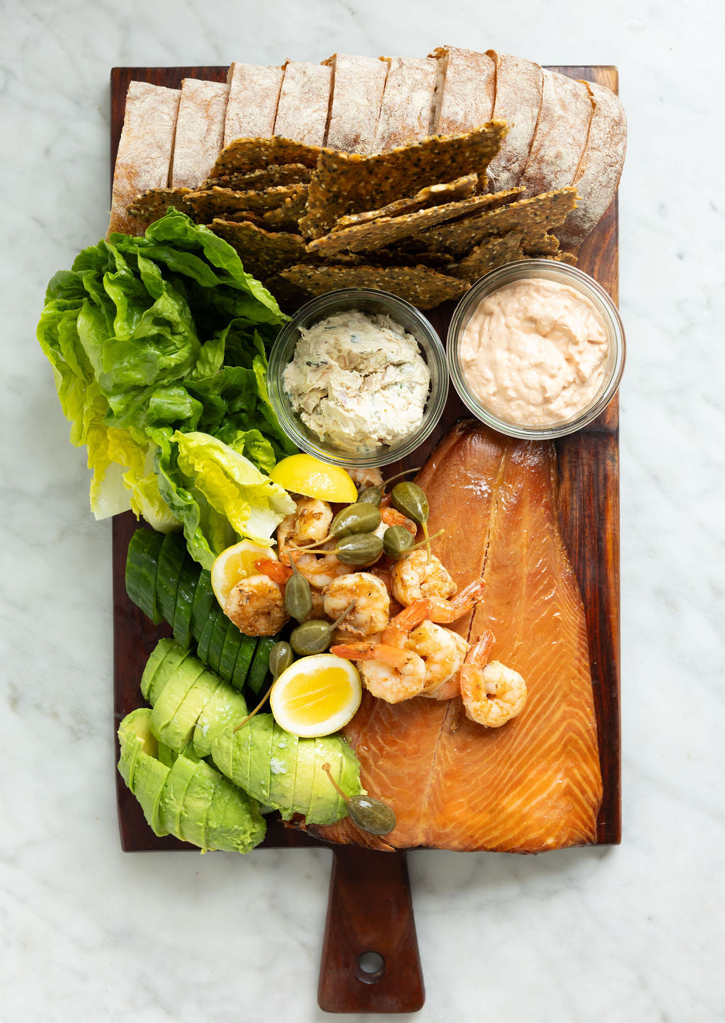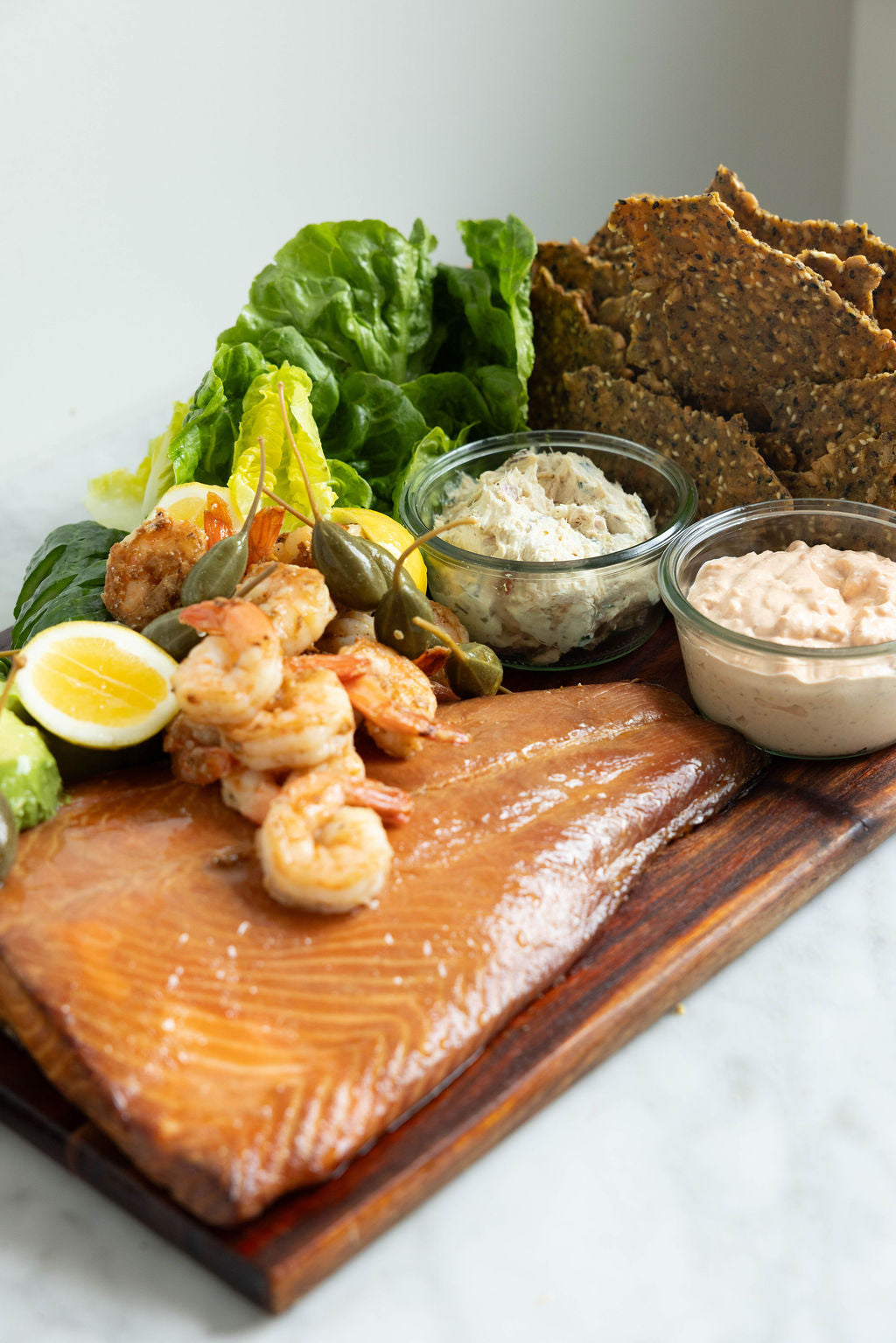 1kg platter featuring house-smoked salmon, smoky Trevally dip, and succulent sautéed prawns (20), marie rose sauce, fresh baby gem, avocado, cucumber, tangy caper berries complete the spread, alongside our homemade seeded crackers (gluten-free) and a crusty ciabatta loaf.