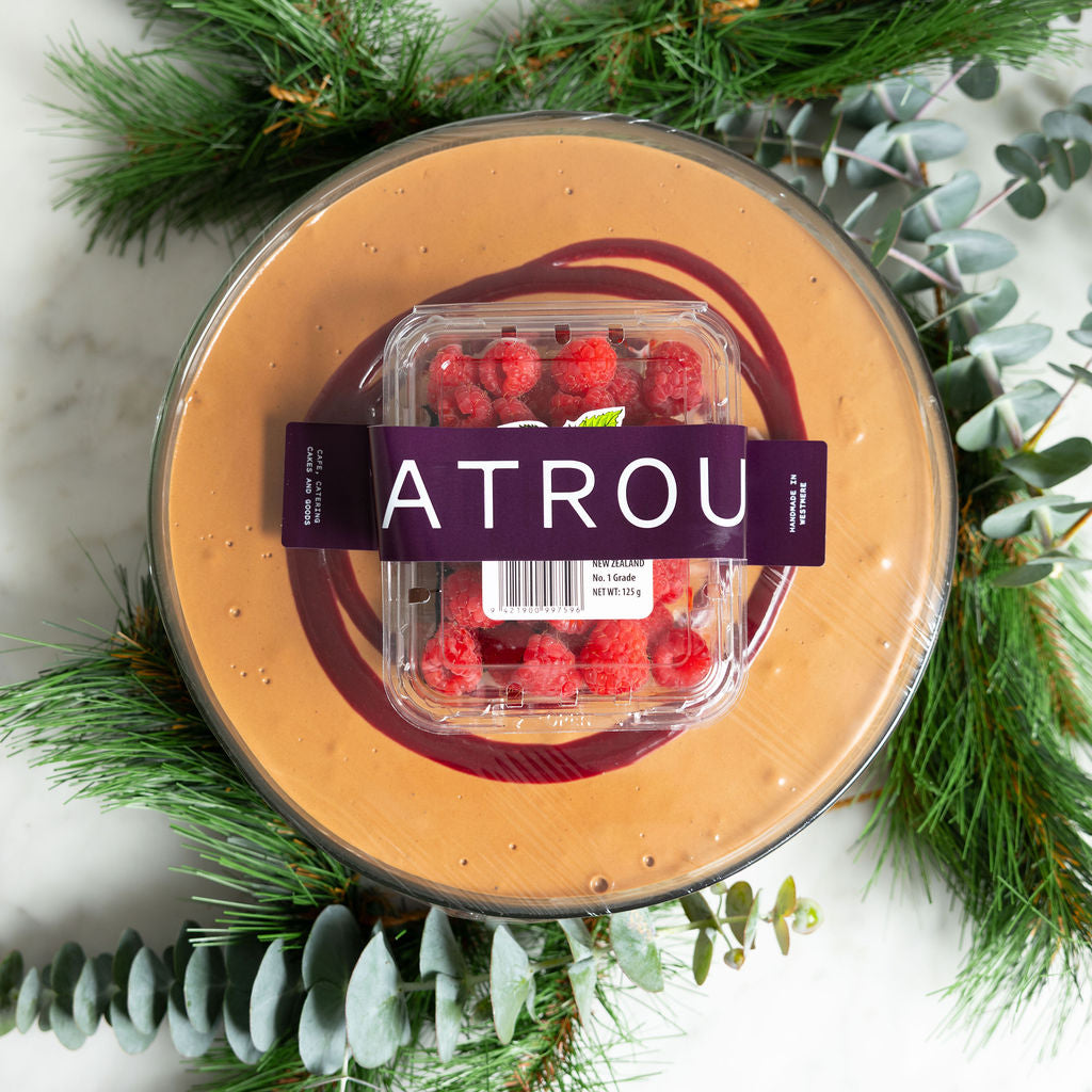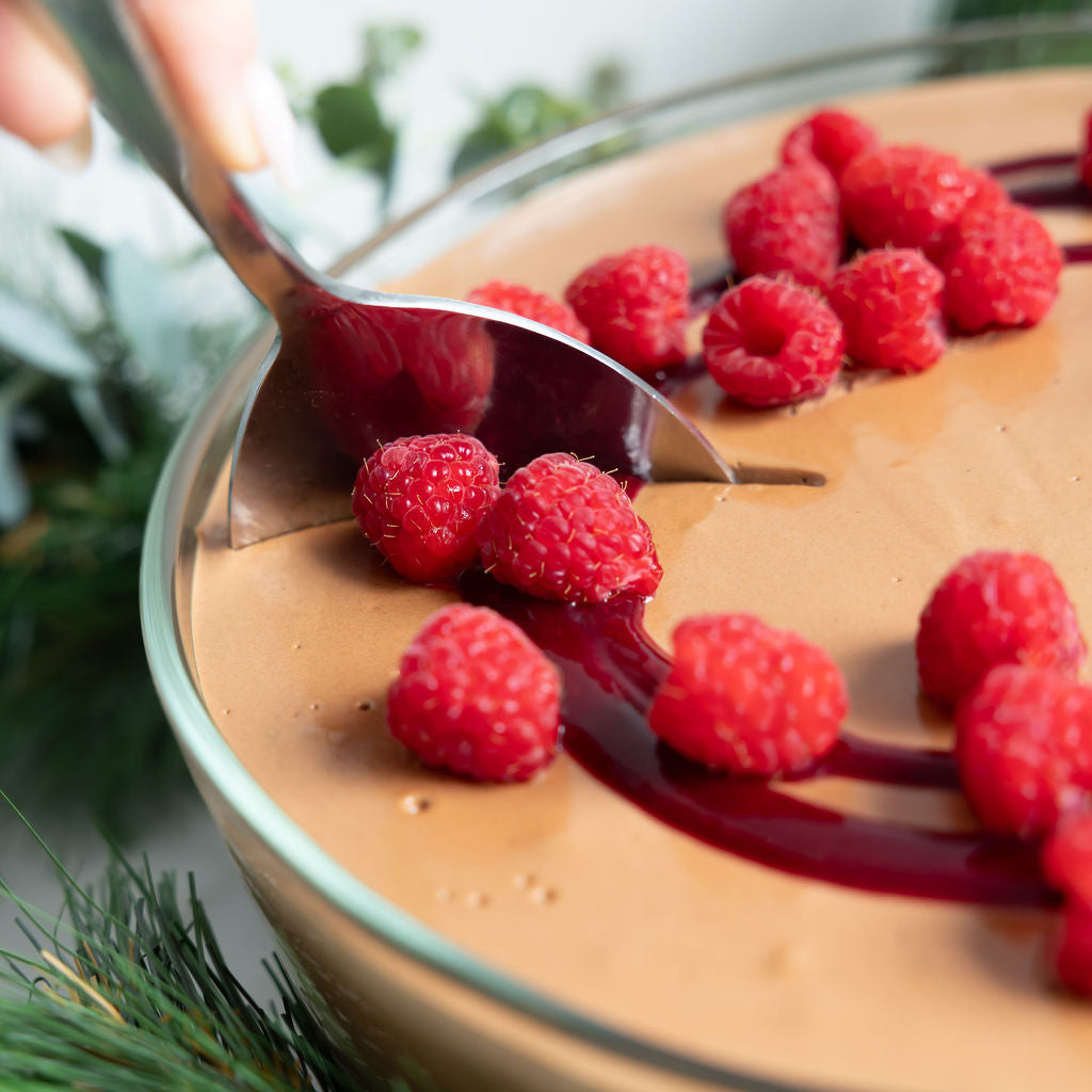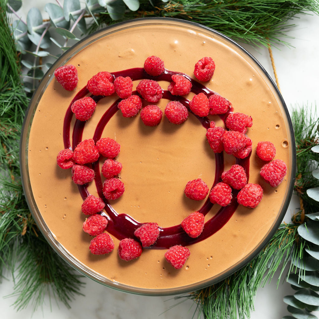 2kg of silky chocolate mousse made with premium 72% chocolate, swirled with raspberry, and topped with fresh raspberries. Gluten-free and nut-free indulgence.
