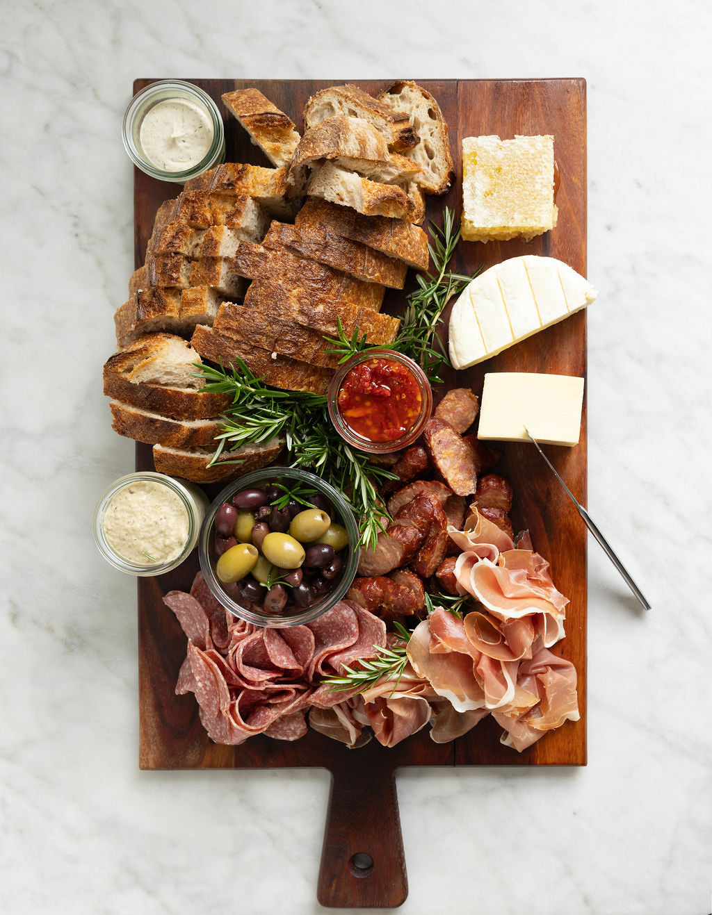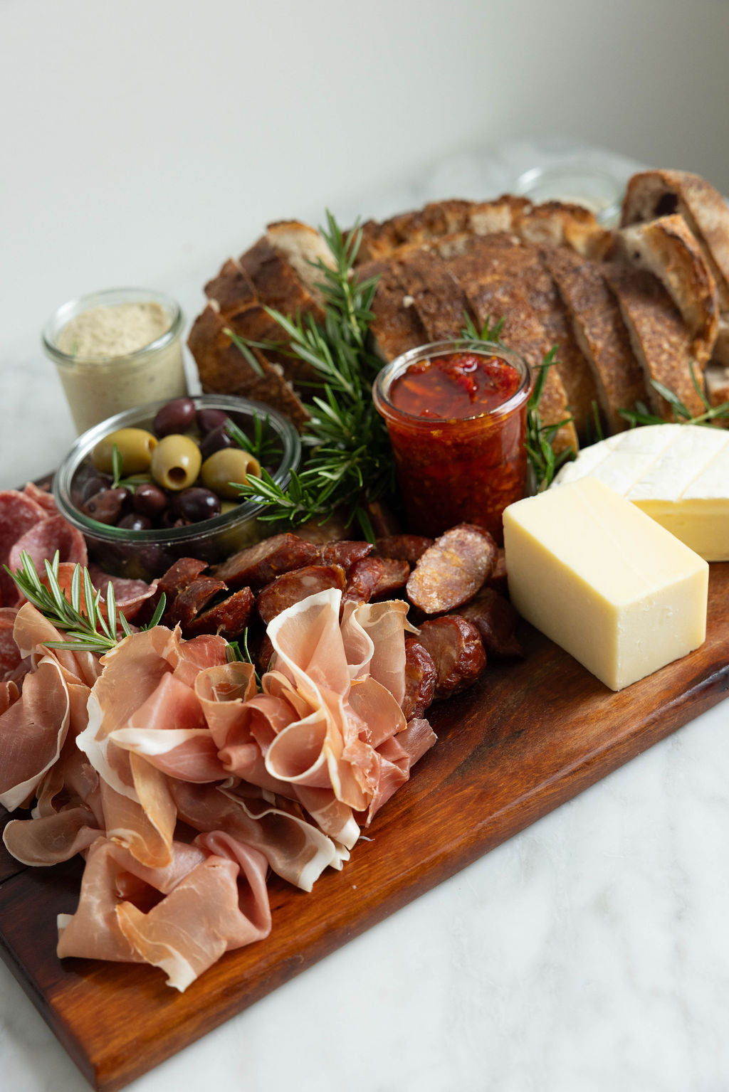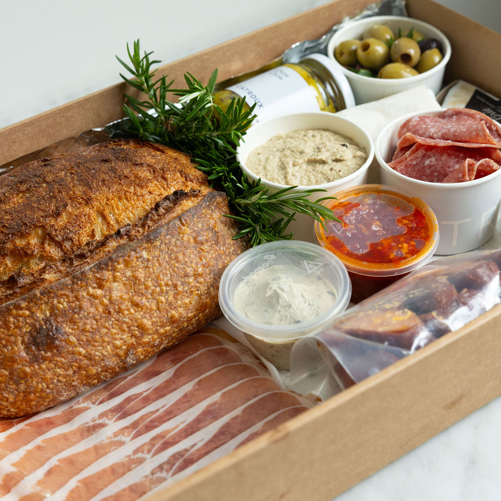 Gather 'round for a flavour-packed adventure! Our grazing platter brings together cured meats—prosciutto, salami, and chorizo—paired with a dreamy cheese selection of Castello and gruyere. Honeycomb adds a touch of sweetness, while baba ganoush, chow chow, and sundried tomato pesto bring bold, vibrant notes. Finish with briny olives, luxurious whipped truffle butter, and crusty sourdough. Pure grazing magic on a board.