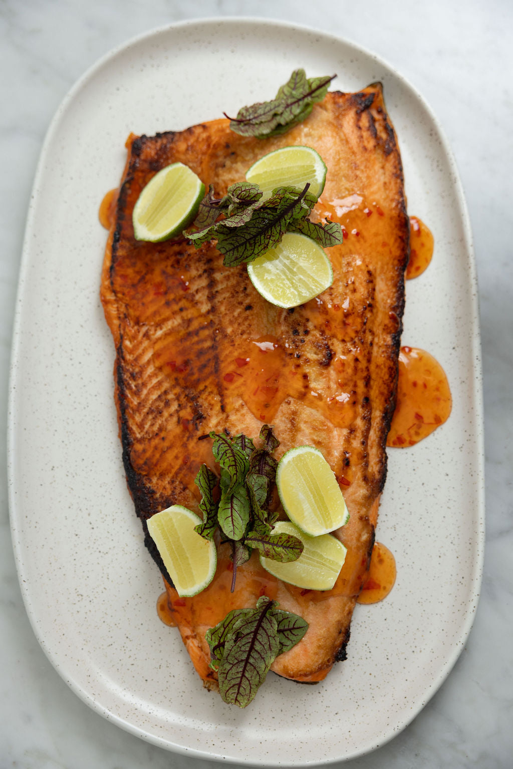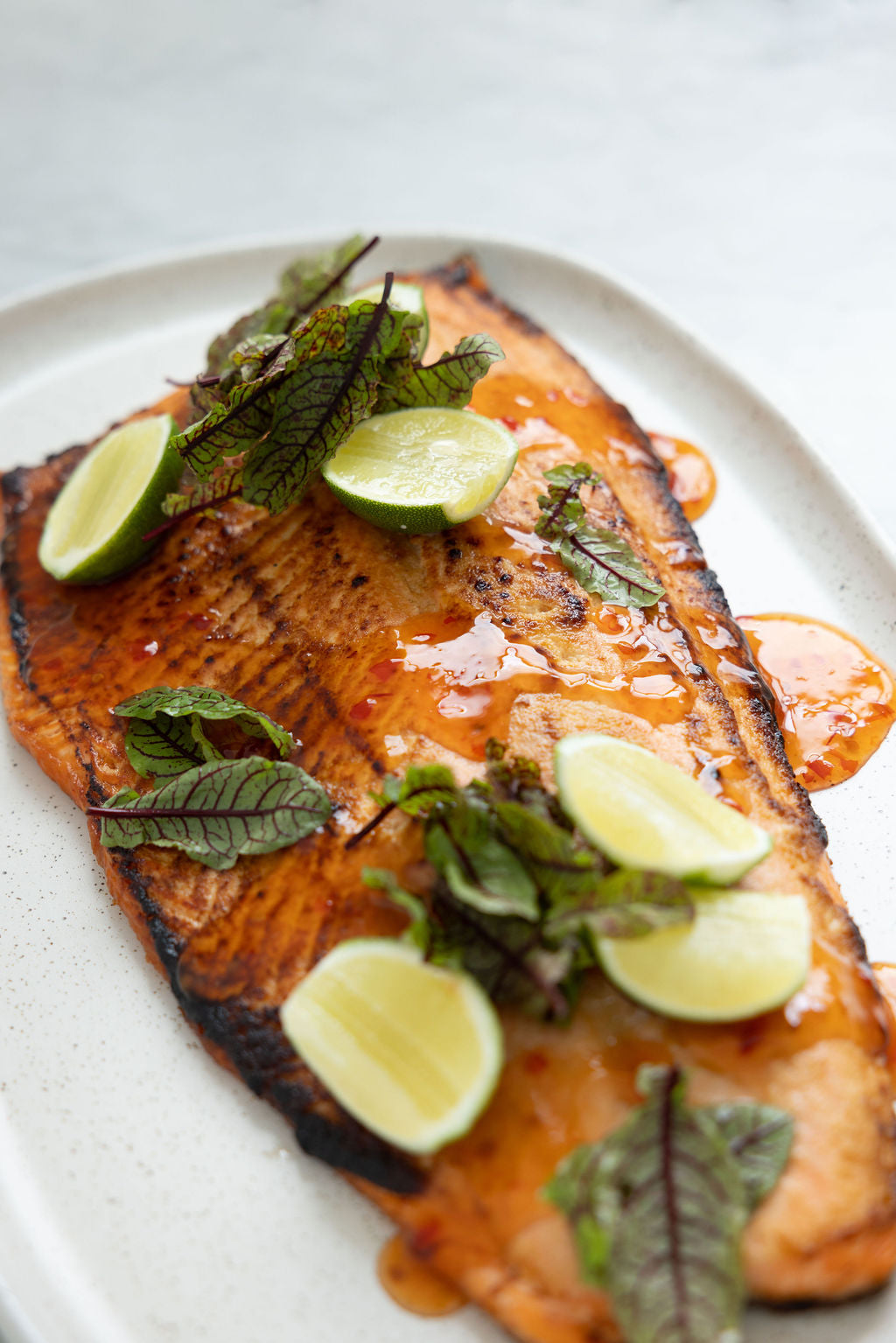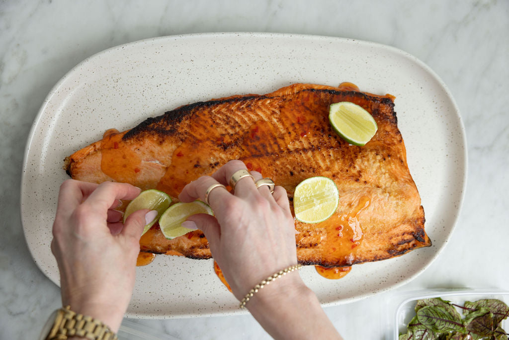 1.8kg Miso, ginger & sesame marinated whole side of salmon, sweet chilli & fresh lime